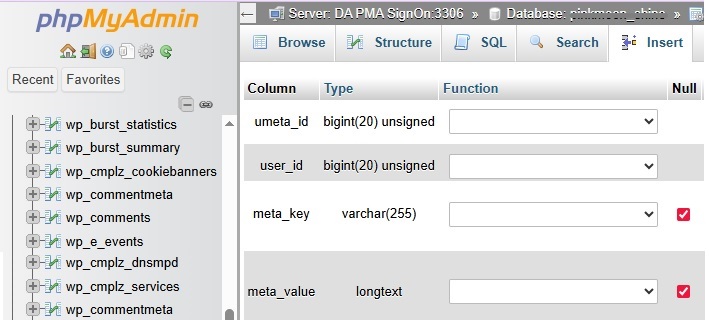 Unmeta_id : در این فیلد، چیزی وارد نکنید. phpMyAdmin به‌ صورت خودکار این قسمت را برای شما پرخواهد کرد.