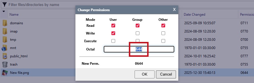 - معمولاً سطح دسترسی 644 برای فایلها کافی و استاندارد است.